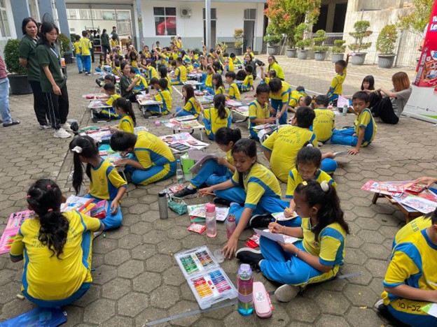 Elementary school students in an art class outdoors